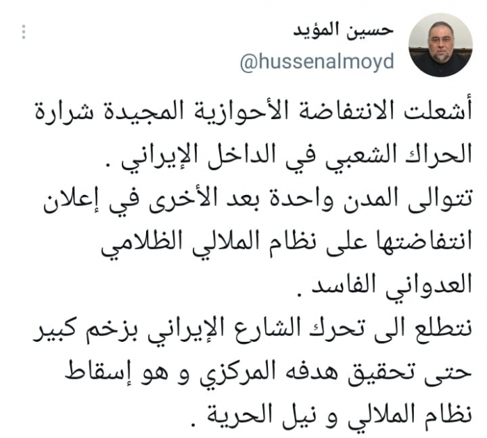 وأكد في تغريدة على حسابه بموقع التدوين المصغر تويتر، اليوم أن: "أشعلت الانتفاضة الأحوازية المجيدة شرارة الحراك الشعبي في الداخل الإيراني".