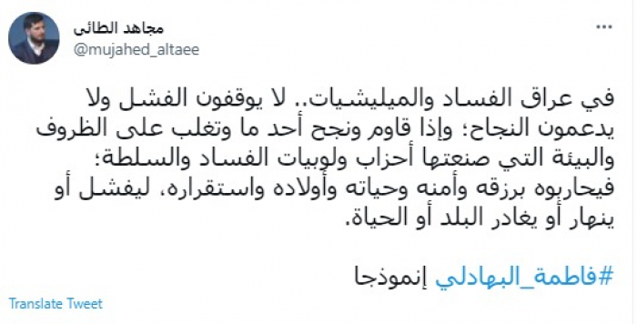 وقال في تغريدة عبر "تويتر" رصدها "المشهد العربي": "في عراق الفساد والميليشيات.. لا يوقفون الفشل ولا يدعمون النجاح؛ وإذا قاوم ونجح أحد ما وتغلب على الظروف والبيئة التي صنعتها أحزاب ولوبيات الفساد والسلطة".