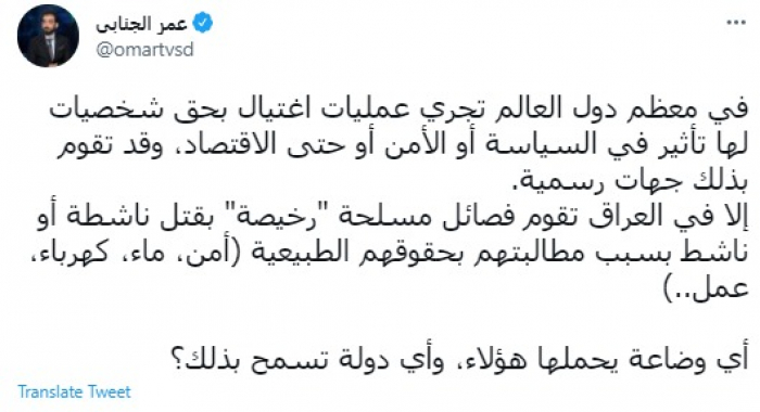 استنكر الكاتب الصحفي عمر الجنابي، اليوم الأحد، استمرار المليشيات في اغتيال أبناء العراق بسبب مطالبتهم بحقوقهم الطبيعية.