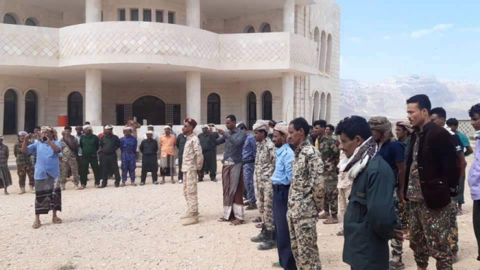 وشهد القدومي بحضور نائبه محمد بن حزوم، استعراضًا قدمته قوات الأمن في المديرية.