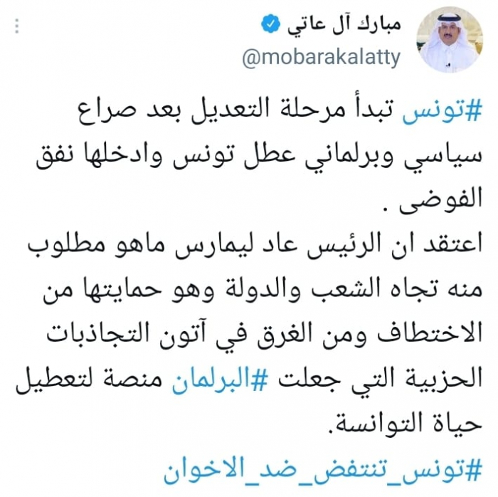 أشاد الكاتب والباحث مبارك آل عاتي بقرارات الرئيس التونسي قيس سعيد لمواجهة فوضى الإخوان، مؤكدا أن تونس تشهد انتفاضة على التنظيم الإرهابي.