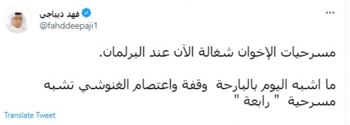 وقال في تغريدة عبر "تويتر" رصدها "المشهد العربي": "مسرحيات الإخوان شغالة الآن عند البرلمان. ما أشبه اليوم بالبارحة وقفة واعتصام الغنوشي تشبه مسرحية رابعة".