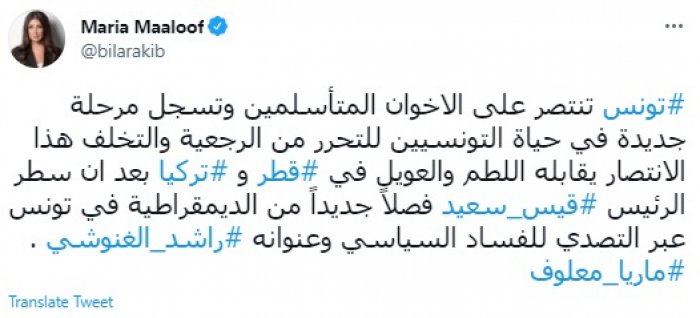 وكتبت في تغريدة عبر "تويتر" رصدها "المشهد العربي": "تونس تنتصر على الإخوان المتأسلمين وتسجل مرحلة جديدة في حياة التونسيين للتحرر من الرجعية والتخلف".