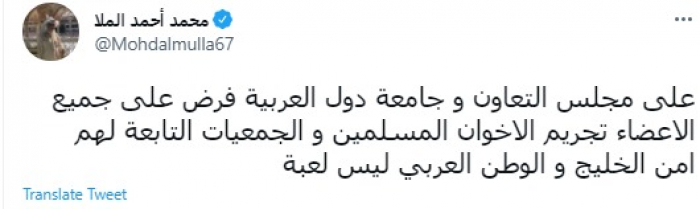 وقال في تغريدة عبر "تويتر" رصدها "المشهد العربي": "على مجلس التعاون وجامعة الدول العربية فرض قرارات على جميع الأعضاء بتجريم الإخوان المسلمين والجمعيات التابعة لهم".
