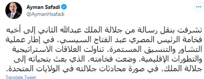 وقال في تغريدة عبر "تويتر" رصدها "المشهد العربي": "تشرفت بنقل رسالة من جلالة الملك عبدالله الثاني إلى أخيه فخامة الرئيس المصري عبد الفتاح السيسي، في إطار عملية التشاور والتنسيق المستمرة، تناولت العلاقات الاستراتيجية والتطورات الإقليمية".