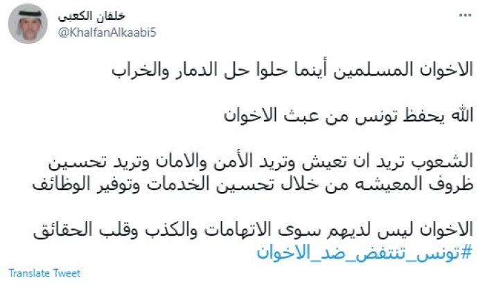 وقال في تغريدة عبر "تويتر" رصدها "المشهد العربي": "الإخوان المسلمين أينما حلوا حل الدمار والخراب الله يحفظ تونس من عبث الإخوان".