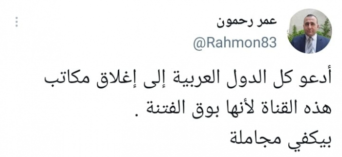وقال في تغريدة على حسابه بموقع التدوين المصغر تويتر، اليوم إني ": "أدعو كل الدول العربية إلى إغلاق مكاتب هذه القناة لأنها بوق الفتنة"، مضيفا: "بيكفي مجاملة".