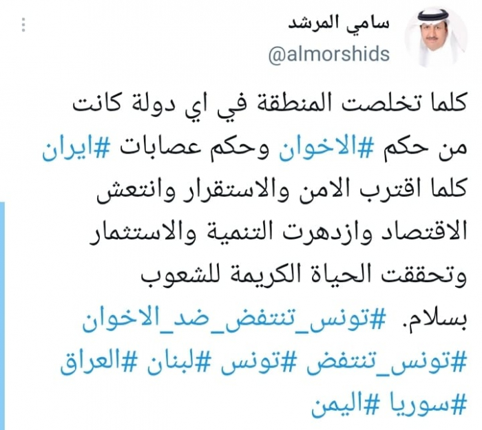 وتابع: "وانتعش الاقتصاد وازدهرت التنمية والاستثمار وتحققت الحياة الكريمة للشعوب بسلام"، مختتما بهاشتاجات: "تونس تنتفض ضد الإخوان، تونس تنتفض، تونس، لبنان، العراق، سوريا، اليمن".