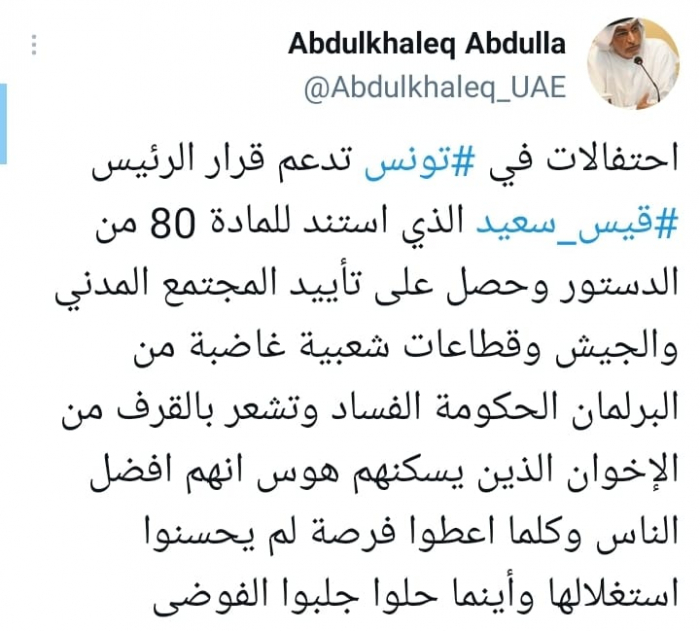 وأوضح في تغريدة على حسابه بموقع التدوين المصغر تويتر، اليوم أن هناك: "احتفالات في تونس تدعم قرار الرئيس قيس سعيد الذي استند للمادة 80 من الدستور وحصل على تأييد المجتمع المدني والجيش وقطاعات شعبية غاضبة من البرلمان الحكومة الفساد وتشعر بالقرف من الإخوان".
