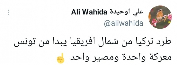 وأوضح في تغريدة على حسابه بموقع التدوين المصغر تويتر، اليوم أن: "طرد تركيا من شمال أفريقيا يبدأ من تونس"، مؤكدا أنها: "معركة واحدة ومصير واحد".