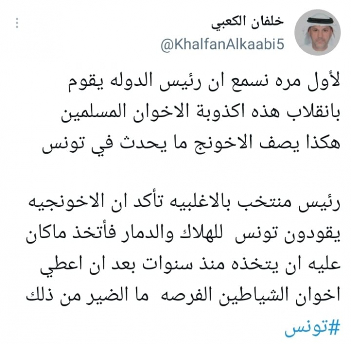 وقال في تغريدة على حسابه بموقع التدوين المصغر تويتر، اليوم إننا: "لأول مرة نسمع أن رئيس الدولة يقوم بانقلاب هذه أكذوبة الإخوان المسلمين، هكذا يصف الإخونج ما يحدث في تونس".