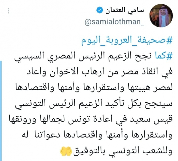 وشدد في تغريدة على حسابه بموقع التدوين المصغر تويتر، اليوم على أنه: "كما نجح الزعيم الرئيس المصري السيسي في إنقاذ مصر من إرهاب الإخوان وأعاد لمصر هيبتها واستقرارها وأمنها واقتصادها سينجح بكل تأكيد الزعيم الرئيس التونسي قيس سعيد في إعادة تونس لجمالها ورونقها واستقرارها وأمنها واقتصادها دعواتنا له وللشعب التونسي بالتوفيق".