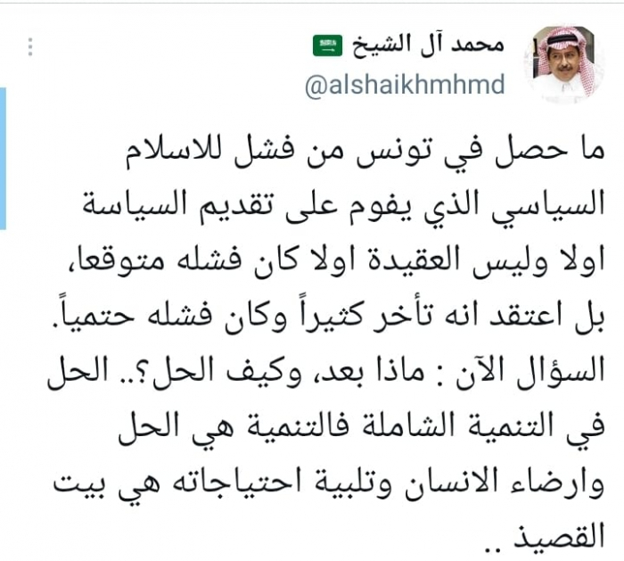 واعتبر في تغريدة على حسابه بموقع التدوين المصغر تويتر، اليوم أن: "ما حصل في تونس من فشل للإسلام السياسي الذي يقوم على تقديم السياسة أولا وليس العقيدة أولا كان فشله متوقعا".