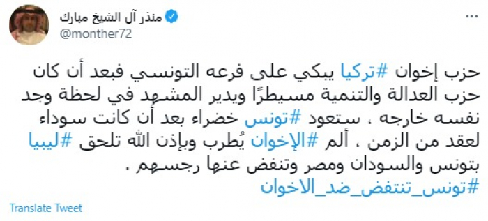 علق المدون السعودي البارز منذر آل الشيخ مبارك، اليوم الأربعاء، على استمرار حزب العدالة والتنمية التركي في انتقاد قرارات الرئيس التونسي قيس سعيد الأخيرة.