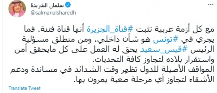 قال الإعلامي السعودي سلمان الشريدة، إن فضائية الجزيرة القطرية أثبتت أنها قناة الفتنة، مؤكدًا أن ما يحدث في تونس شأن داخلي.
