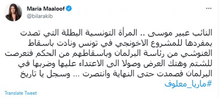 وقالت في تغريدة عبر "تويتر" رصدها "المشهد العربي": "النائب عبير موسى .. المرأة التونسية البطلة التي تصدت بمفردها للمشروع الإخوانجي في تونس ونادت بإسقاط الغنوشي من رئاسة البرلمان وبإسقاطهم من الحكم".