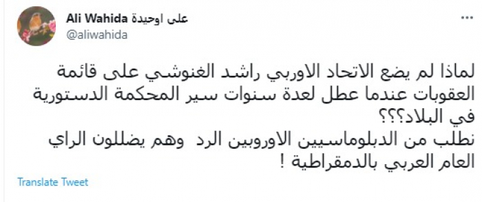 وقال في تغريدة عبر "تويتر" رصدها "المشهد العربي": "لماذا لم يضع الاتحاد الأوروبي راشد الغنوشي على قائمة العقوبات عندما عطل لعدة سنوات سير المحكمة الدستورية في البلاد؟".