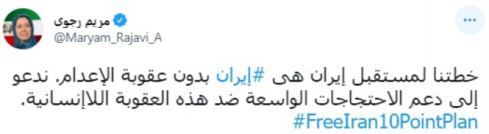 وقالت في تغريدة عبر "تويتر" رصدها "المشهد العربي": "خطتنا لمستقبل إیران هی إیران بدون عقوبة الإعدام. ندعو إلی دعم الاحتجاجات الواسعة ضد هذه العقوبة اللاإنسانیة".