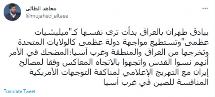 وقال في تغريدة عبر "تويتر" رصدها "المشهد العربي": "بيادق طهران بالعراق بدأت ترى نفسها كميليشيات عظمى وتستطيع مواجهة دولة عظمى كالولايات المتحدة وتخرجها من العراق والمنطقة وغرب آسيا".