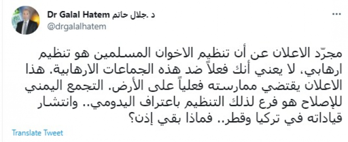 حاتم: يجب وضع حزب الإصلاح على لائحة الإرهاب