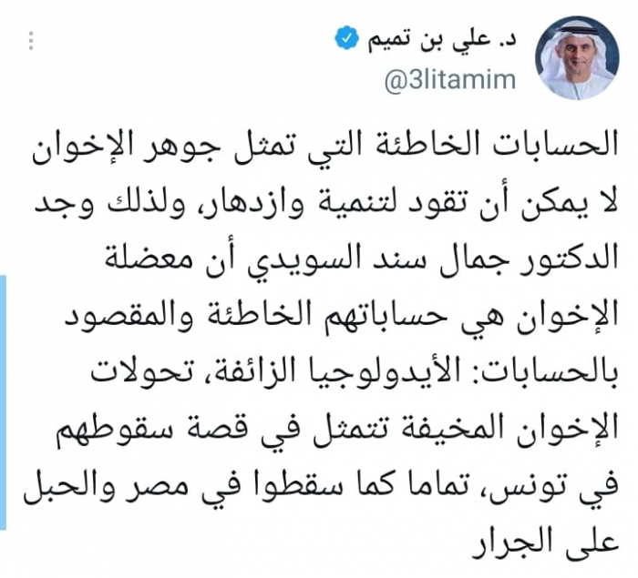 وأضاف أنه: "لذلك وجد الدكتور جمال سند السويدي أن معضلة الإخوان هي حساباتهم الخاطئة والمقصود بالحسابات: الأيدولوجيا الزائفة".