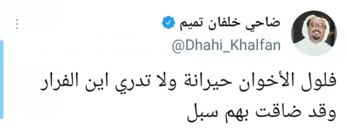 وقال في تغريدة على حسابه بموقع التدوين المصغر تويتر، اليوم إن: "فلول الإخوان حيرانة ولا تدري أين الفرار وقد ضاقت بهم سبل".