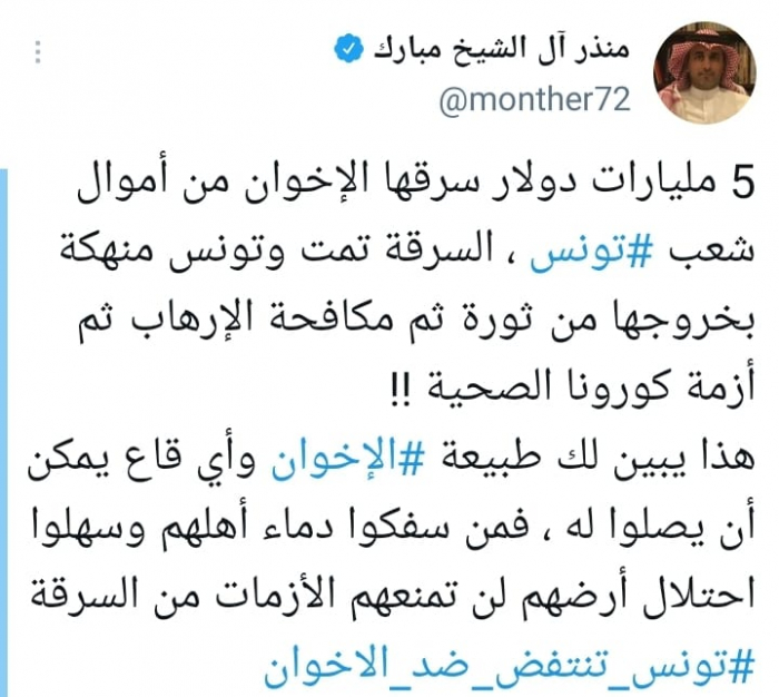 وكشف في تغريدة على حسابه بموقع التدوين المصغر تويتر، اليوم أن: "5 مليارات دولار سرقها الإخوان من أموال شعب تونس".