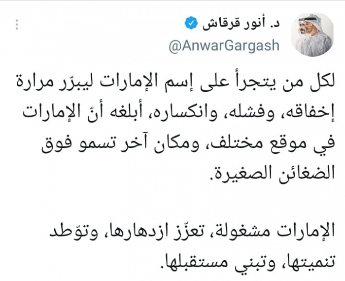 وأضاف: "أبلغه أنّ الإمارات في موقع مختلف، ومكان آخر تسمو فوق الضغائن الصغيرة. الإمارات مشغولة، تعزّز ازدهارها، وتوّطد تنميتها، وتبني مستقبلها".