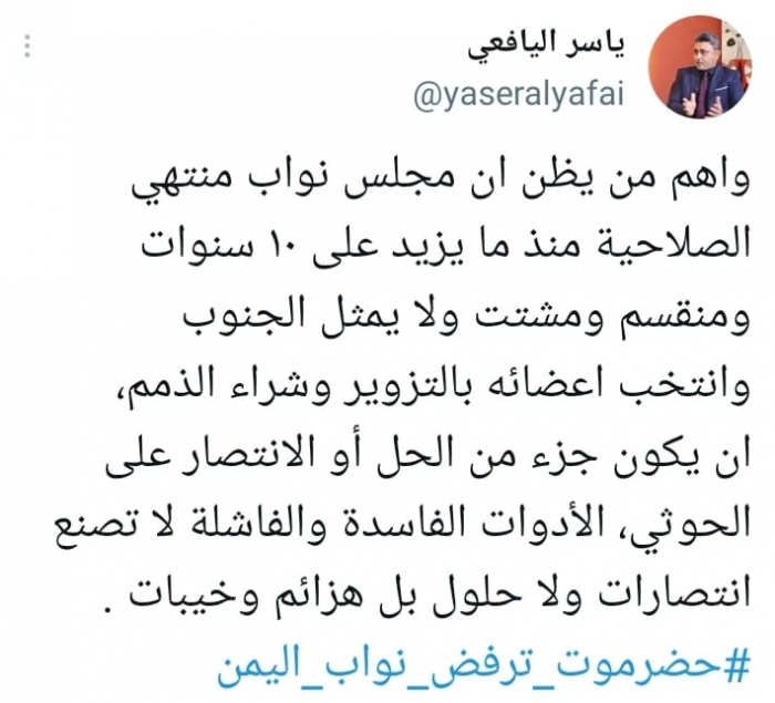 وشدد في تغريدة على حسابه بموقع التدوين المصغر تويتر، اليوم على أنه: "واهم من يظن أن مجلس نواب منتهي الصلاحية منذ ما يزيد على 10 سنوات ومنقسم ومشتت ولا يمثل الجنوب وانتخب أعضائه بالتزوير وشراء الذمم، أن يكون جزءا من الحل أو الانتصار على الحوثي".