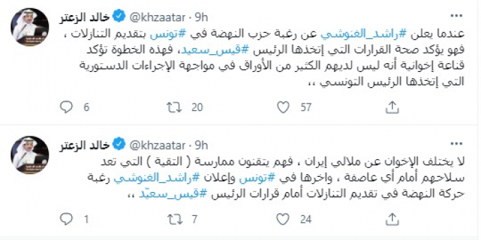 وكتب في تغريدات عبر "تويتر" رصدها "المشهد العربي": "لا يختلف الإخوان عن ملالي إيران ، فهم يتقنون ممارسة (التقية) التي تعد سلاحهم أمام أي عاصفة، وآخرها في تونس وإعلان راشد الغنوشي رغبة حركة النهضة في تقديم التنازلات أمام قرارات الرئيس قيس سعيّد".