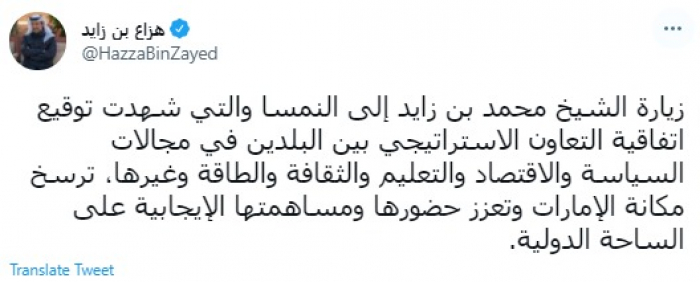 أشاد نائب رئيس المجلس التنفيذي لإمارة أبوظبي الشيخ هزاع بن زايد آل نهيان، اليوم الجمعة، بزيارة ولي عهد أبوظبي نائب القائد الأعلى للقوات المسلحة الإماراتية الشيخ محمد بن زايد آل نهيان للنمسا.