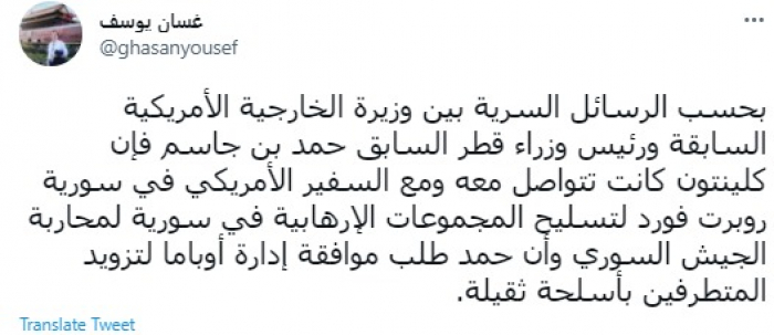 وقال في تغريدة عبر "تويتر" رصدها "المشهد العربي": "بحسب الرسائل السرية بين وزيرة الخارجية الأمريكية السابقة ورئيس وزراء قطر السابق حمد بن جاسم فإن كلينتون كانت تتواصل معه ومع السفير الأمريكي في سوريا روبرت فورد لتسليح المجموعات الإرهابية في سورية لمحاربة الجيش السوري وأن حمد طلب موافقة إدارة أوباما لتزويد المتطرفين بأسلحة ثقيلة".