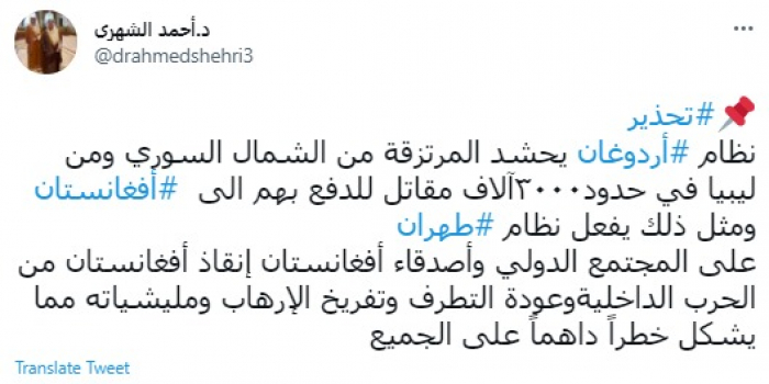 وقال في تغريدة عبر "تويتر" رصدها "المشهد العربي": "نظام أردوغان يحشد المرتزقة من الشمال السوري ومن ليبيا في حدود ٣٠٠٠ آلاف مقاتل للدفع بهم الى أفغانستان ومثل ذلك يفعل نظام طهران ".