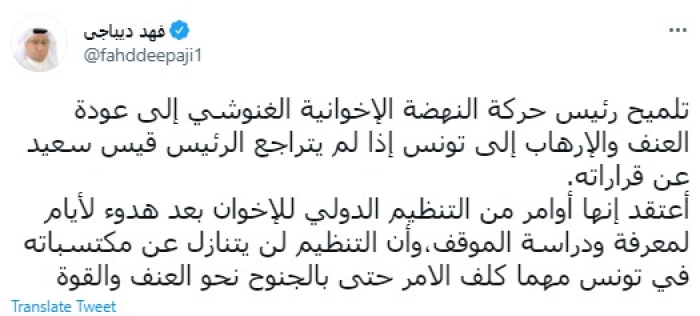 وقال في تغريدة عبر "تويتر" رصدها "المشهد العربي": "تلميح رئيس حركة النهضة الإخوانية الغنوشي إلى عودة العنف والإرهاب إلى تونس إذا لم يتراجع الرئيس قيس سعيد عن قراراته".