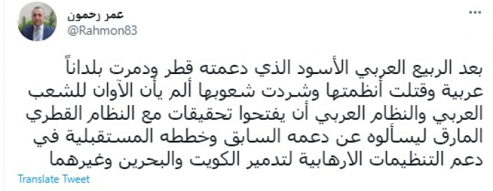 وقال في تغريدة عبر "تويتر" رصدها "المشهد العربي": "بعد الربيع العربي الأسود الذي دعمته قطر ودمرت بلدانًا عربية وقتلت أنظمتها وشردت شعوبها ألم يأن الآوان للشعب العربي والنظام العربي أن يفتحوا تحقيقات مع النظام القطري المارق".