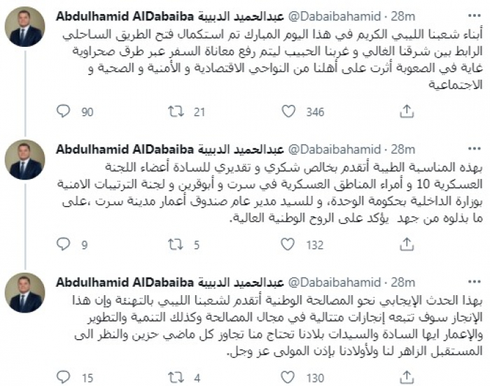 وقال في سلسلة تغريدات عبر "تويتر" رصدها "المشهد العربي": "أبناء شعبنا الليبي الكريم في هذا اليوم المبارك تم استكمال فتح الطريق الساحلي الرابط بين شرقنا الغالي وغربنا الحبيب ليتم رفع معاناة السفر عبر طرق صحراوية غاية في الصعوبة أثرت على أهلنا من النواحي الاقتصادية والأمنية والصحية والاجتماعية".
