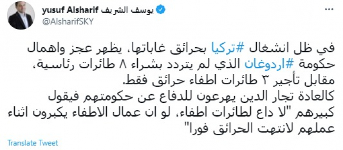 وكتب في تغريدة عبر "تويتر" رصدها "المشهد العربي": "في ظل انشغال تركيا بحرائق غاباتها، يظهر عجز وإهمال حكومة أردوغان الذي لم يتردد بشراء ٨ طائرات رئاسية، مقابل تأجير ٣ طائرات اطفاء حرائق فقط".