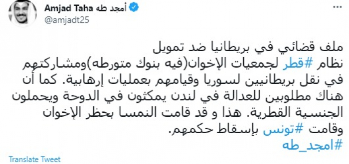 وقال في تغريدة عبر "تويتر" رصدها "المشهد العربي": "ملف قضائي في بريطانيا ضد تمويل نظام قطر لجمعيات الإخوان (فيه بنوك متورطة) ومشاركتهم في نقل بريطانيين لسوريا وقيامهم بعمليات إرهابية".