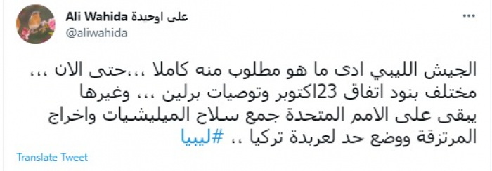 وقال في تغريدة عبر "تويتر" رصدها "المشهد العربي": "الجيش الليبي ادى ما هو مطلوب منه كاملا ،،،حتى الآن ،،، مختلف بنود اتفاق 23 أكتوبر وتوصيات برلين ،،، وغيرها".