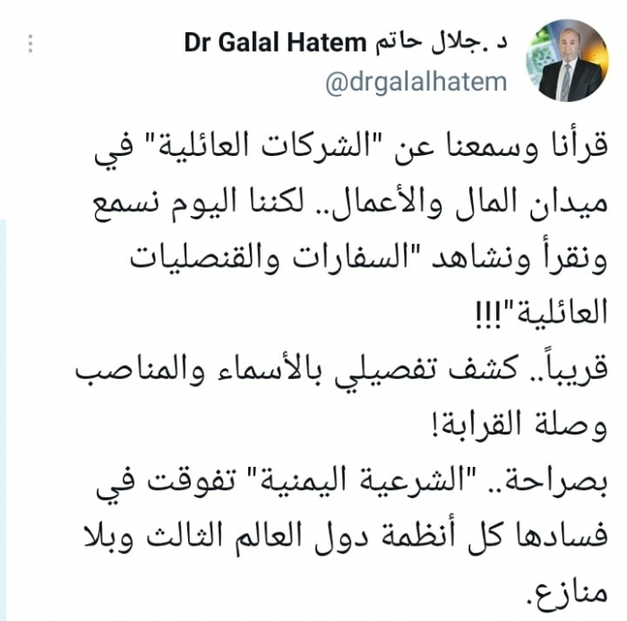 وأوضح: "لكننا اليوم نسمع ونقرأ ونشاهد السفارات والقنصليات العائلية، معلنا أنه: "قريبا.. كشف تفصيلي بالأسماء والمناصب وصلة القرابة!".