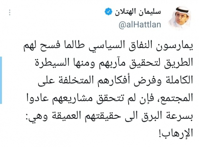 وقال في تغريدة على حسابه بموقع التدوين المصغر تويتر، اليوم إنهم: "يمارسون النفاق السياسي طالما فسح لهم الطريق لتحقيق مآربهم ومنها السيطرة الكاملة وفرض أفكارهم المتخلفة على المجتمع".