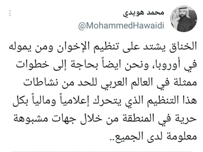 وقال في تغريدة على حسابه بموقع التدوين المصغر تويتر، اليوم إن: "الخناق يشتد على تنظيم الإخوان ومن يموله في أوروبا".