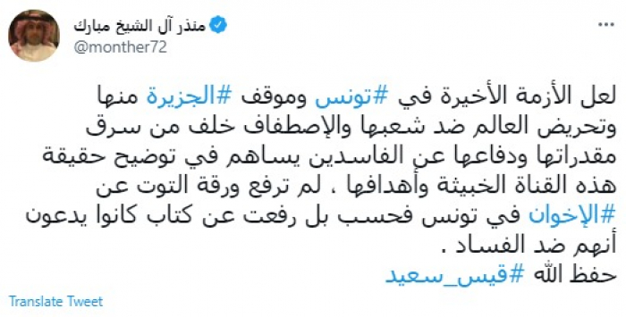 وكتب في تغريدة عبر "تويتر" رصدها "المشهد العربي": "لعل الأزمة الأخيرة في تونس وموقف الجزيرة منها وتحريض العالم ضد شعبها والاصطفاف خلف من سرق مقدراتها ودفاعها عن الفاسدين يساهم في توضيح حقيقة هذه القناة الخبيثة وأهدافها".