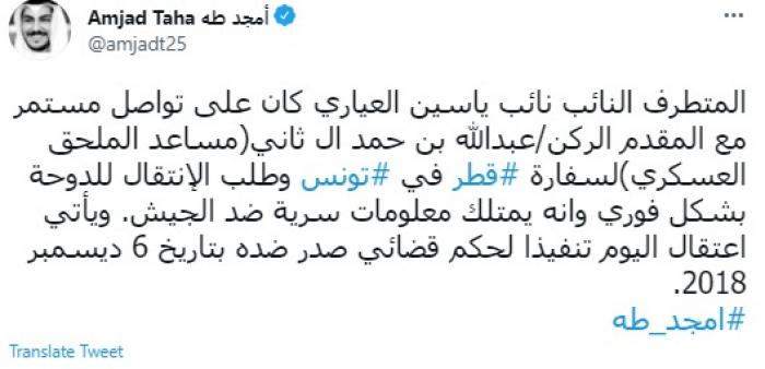 وقال في تغريدة عبر "تويتر" رصدها "المشهد العربي": "المتطرف النائب نائب ياسين العياري كان على تواصل مستمر مع المقدم الركن/عبدالله بن حمد ال ثاني (مساعد الملحق العسكري) لسفارة قطر في تونس وطلب الانتقال للدوحة بشكل فوري وأنه يمتلك معلومات سرية ضد الجيش".