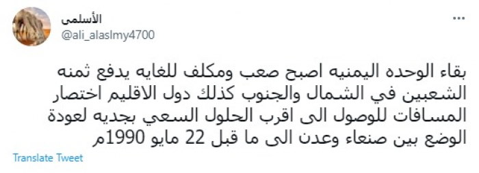 وكتب في تغريدة عبر "تويتر" رصدها "المشهد العربي": "بقاء الوحدة اليمنية أصبح صعب ومكلف للغاية يدفع ثمنه الشعبين في الشمال والجنوب".