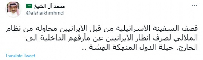 وكتب في تغريدة عبر "تويتر" رصدها "المشهد العربي": "قصف السفينة الإسرائيلية من قبل الإيرانيين محاولة من نظام الملالي لصرف أنظار الإيرانيين عن مآزقهم الداخلية إلى الخارج. حيلة الدول المنهكة الهشة".