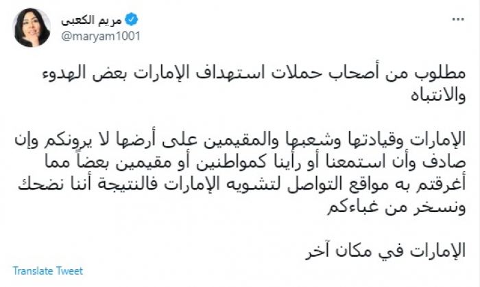 وقالت في تغريدة عبر "تويتر" رصدها "المشهد العربي": "مطلوب من أصحاب حملات استهداف الإمارات بعض الهدوء والانتباه الإمارات وقيادتها وشعبها والمقيمين على أرضها لا يرونكم".