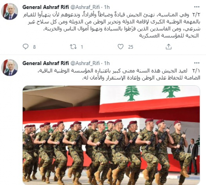 وأضاف: "وفي المناسبة، نهنئ الجيش قيادةً وضباطًا وأفرادا، وندعوهم لأن يتهيأوا للقيام بالمهمة الوطنية الكبرى لإقامة الدولة وتحرير الوطن من الدويلة ومن كل سلاح غير شرعي، ومن الفاسدين الذين فرّطوا بالسيادة ونهبوا أموال الناس والخزينة. التحية للمؤسسة العسكرية".