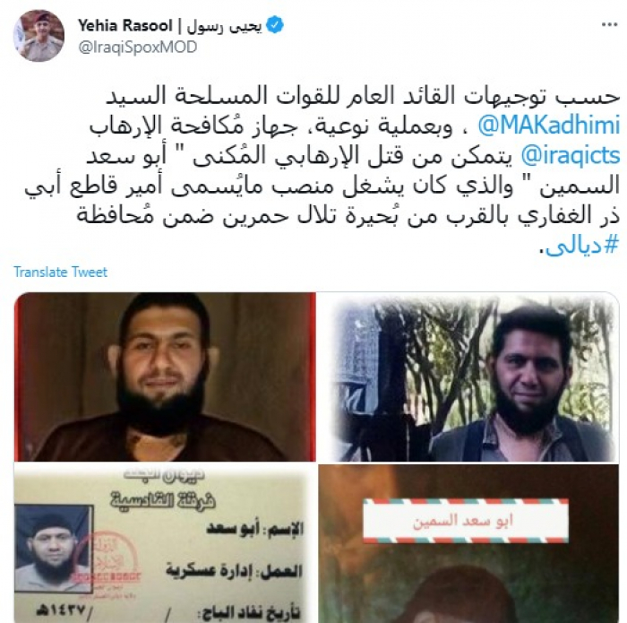 وقال في تغريدة عبر "تويتر" رصدها "المشهد العربي": حسب توجيهات القائد العام للقوات المسلحة السيد مصطفى الكاظمي وبعملية نوعية، جهاز مُكافحة الإرهاب يتمكن من قتل الإرهابي المُكنى أبو سعد السمين والذي كان يشغل منصب مايُسمى أمير قاطع أبي ذر الغفاري بالقرب من بُحيرة تلال حمرين ضمن مُحافظة ديالى".