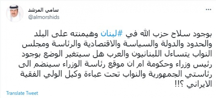 وقال في تغريدة عبر "تويتر" رصدها "المشهد العربي": "بوجود سلاح حزب الله في لبنان وهيمنته على البلد والحدود والدولة والسياسة والاقتصادية والرئاسة ومجلس النواب يتساءل اللبنانيون والعرب".